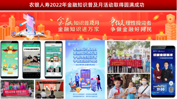 近日,农银人寿2022年“金融联合教育宣传活动”圆满落下帷幕,总分联动合力开展网格式金融教育宣传,精准施教惠及万家百姓。近年来,农银人寿始终坚持以人民为中心发展理念,不断强化消费者权益保护机制体制建设,围绕金融使命,立足民生需求,推进实施服务升温、安享服务等系列惠民工程,积极主动开展全方位、多角度、常态化的消费者权益保护教育宣传,向公众普及健康金融知识,引导树立科学理性消费观,以行动践行金融为民初心。