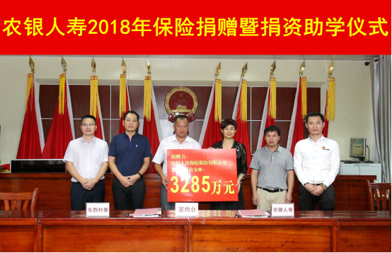 8月30日,农银人寿2018年“7·8全国保险公众宣传日”保险扶贫项目和捐资助学项目签约仪式在广西河池市巴马县那社乡人民政府举行,标志着农银人寿2018年7·8扶贫项目正式落地广西。农银人寿与该乡东烈村委正式签订扶贫合作协议,向该村建档立卡贫困人员捐赠团体意外保险,累计保险金额3285万元。与此同时,农银人寿对该村2018年被大中专院校录取的5名贫困大学生进行资助,直至其大学毕业,累计资助5.1万元。农银人寿这一善举获得广西保监局、当地人民政府和当地村民的一致赞许。